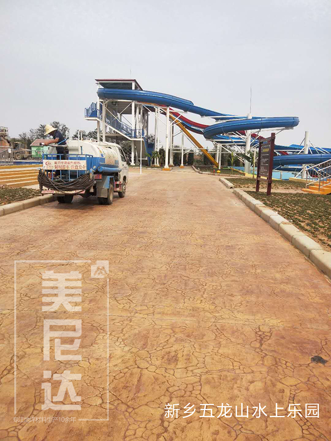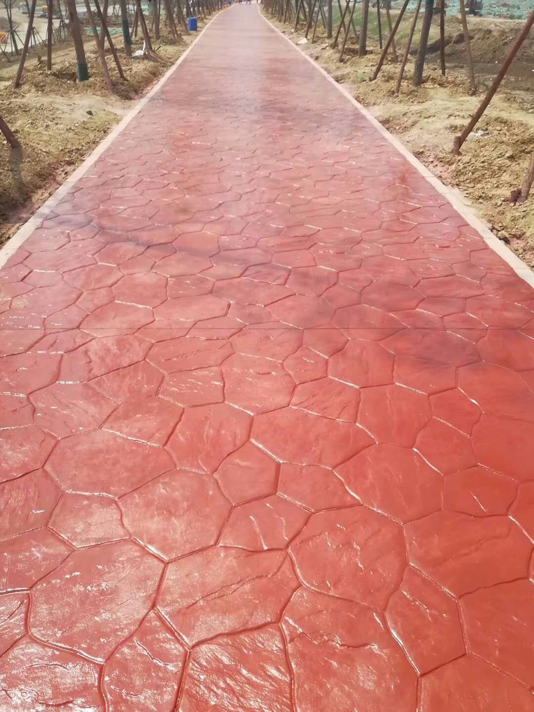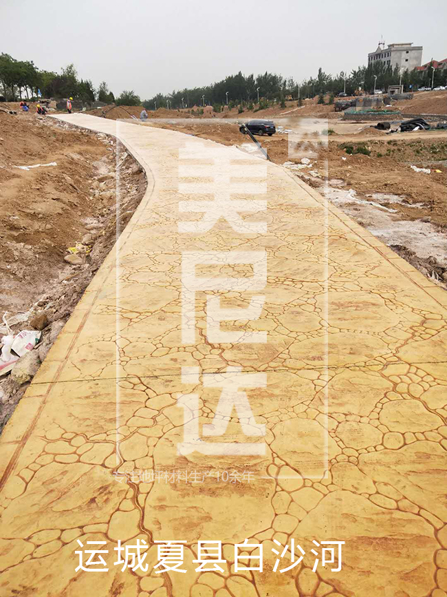 4.彩色脫模粉處理:施工的表面均勻拋撒彩色脫模粉,將整個(gè)表面覆蓋,同時(shí)在模具的表面也上一些脫模粉;